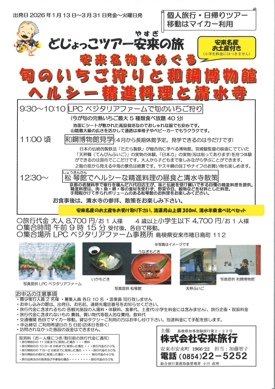 9:30~10:10 LPCベジタリアファームでいちご狩り(今が旬の完熟いちご最大5種類食べ放題40分) 地面にシートが敷かれた高設栽培なのでおしゃれな服でも安心です。 山陰最大級の広さを活かして通路は車椅子やベビーカーでもラクラクです。 11:00頃 和鋼博物館見学(4月から長期休館予定。見学できるのは今だけです) 日本の伝統的製鉄法「たたら製鉄」が総合的に学べる博物館。 宮崎駿監督の映画にでていた「天秤鞴(てんびんふいご)」の実物の体験、 「日本刀」の実物(刃はなくしてあります)を持つ体験ができるのは国内でここだけです。 12:30~ 清水寺松琴館(精進料理の昼食と清水寺散策) 京都の老舗料亭で修行を積んだ六代目店主が、味と伝統を受け継いで作る自慢の 精進料理を提供。精進料理は、肉・魚・卵・等の食材を使わず、野菜や豆、穀物 などを材料とした料理。 お食事後は、清水寺の参拝、散策をお楽しみ下さい。 |