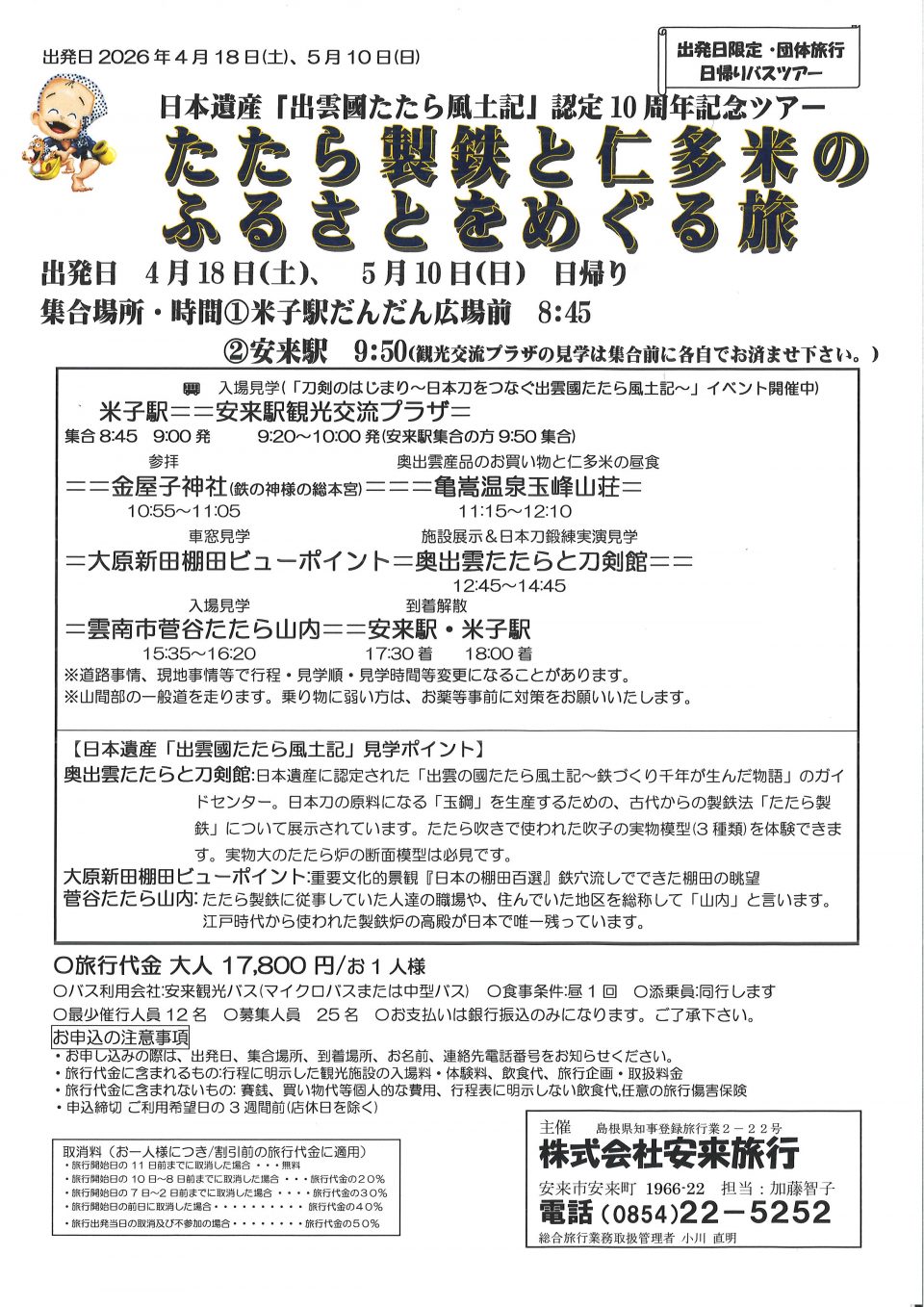 日本遺産「出雲國たたら風土記」認定10周年記念 たたら製鉄と仁多米のふるさとをめぐる旅